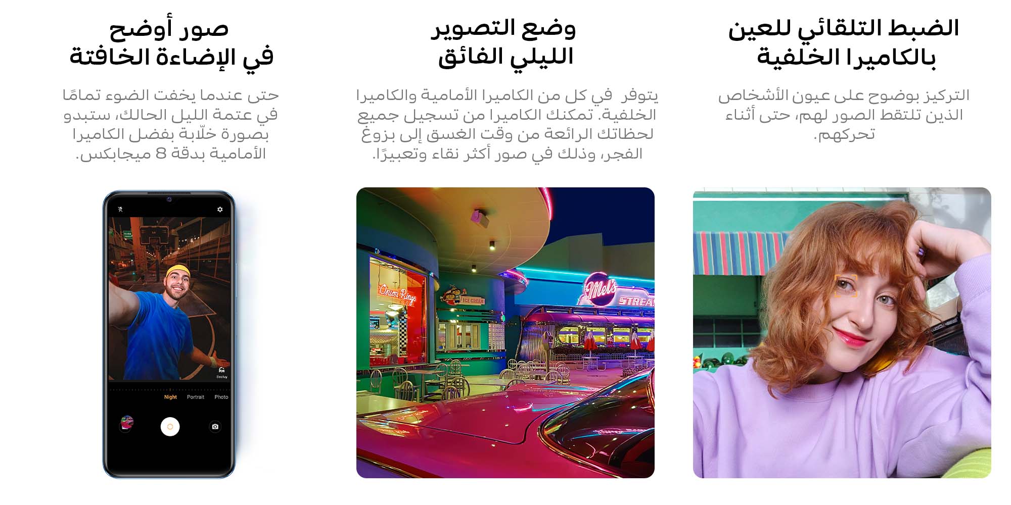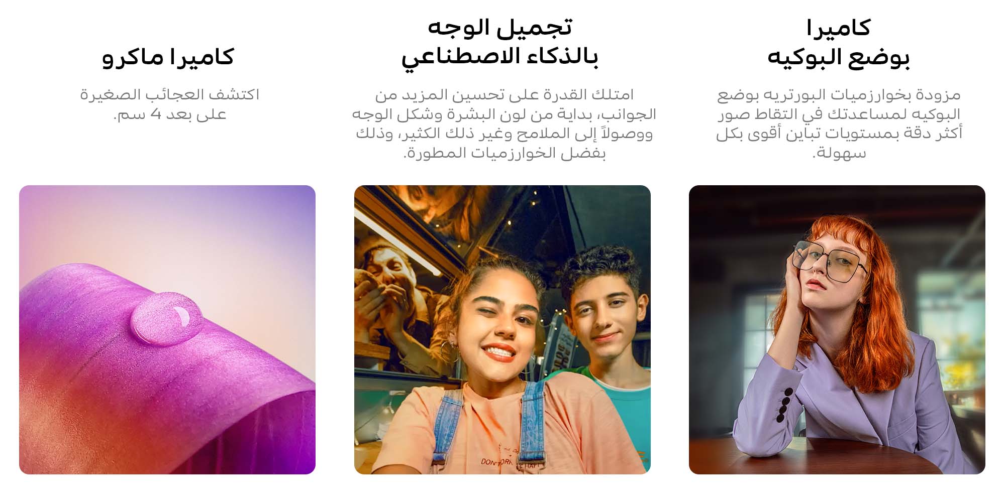 كاميرا خلفية رئيسية 50 ميجا بيكسل + كاميرا 2 ميجا بيكسل + 2 ميجا بيكسل | كاميرا سيلفي 8 ميجا بكسل | كاميرا ماكرو | الوضع الليلي الفائق | فيديو مزدوج العرض | تجميل الوجه بالذكاء الاصطناعي | التركيز البؤري التلقائي للعين في الكاميرا الخلفية | متعدد الأنماط بورتريه.